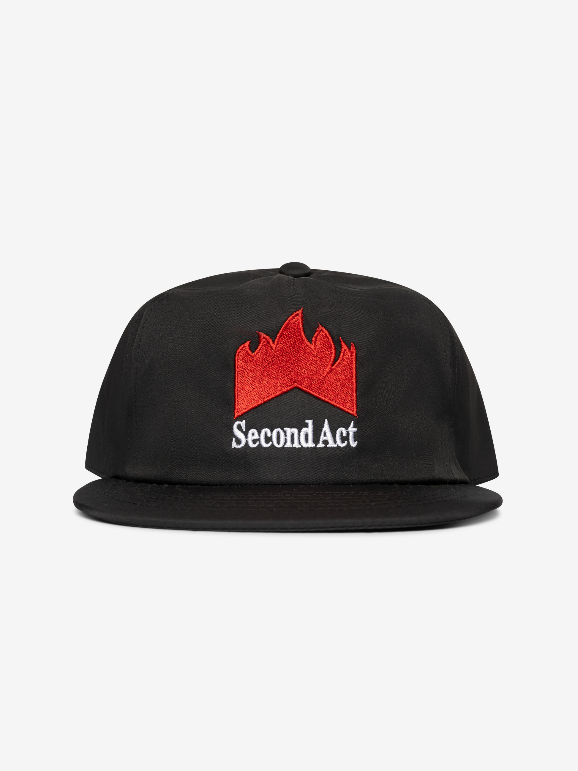 Unstructured 5 panel nylon snapback with embroidered flames logo.